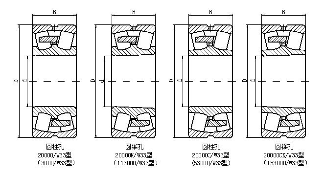 调心滚子轴承为双列球面滚子轴承,内圈有两列滚道,外圈为球面滚道,外圈滚动面中心与轴承中心一致。自动调心性能好,可补偿轴与外壳孔之间的安装误差或轴挠曲使内外圈产生的倾斜即同轴度误差。该类轴承径向负荷能力较大,同时也可承受任一方向的轴向负荷,单不能承受纯轴向负荷,特别适用于重载荷或振动冲击载荷下的工作。