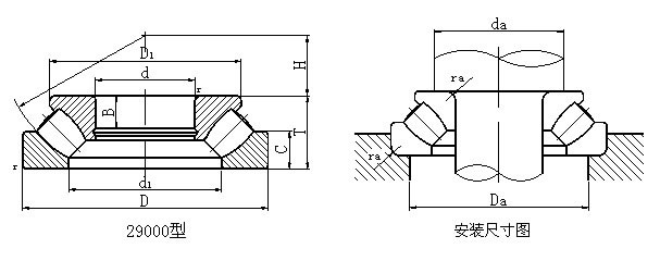 该类轴承主要应用于承受以轴向负荷为主导的轴、径向联合负荷,单径向负荷不得超过轴向负荷的55%,与其他推力滚子轴承相比,此种轴承摩擦系数低,极限转速高,且具有调心性能,本型录所列29000型推力调心滚子轴承为经过优化设计的加强型轴承,此种轴承的球面滚子为非对称性球面滚子,能减少滚子和滚道在工作中的相对滑动,并且滚子长、直径大、滚子数量多、负荷容量高,通常采用油润滑,转速较低时也可脂润滑。